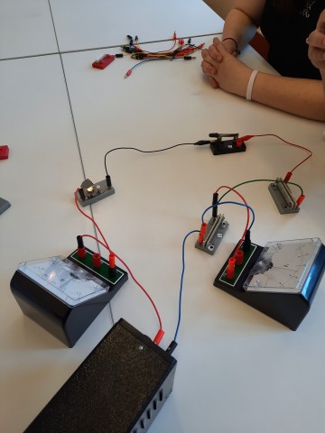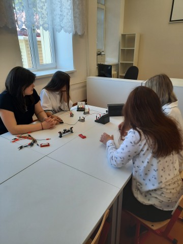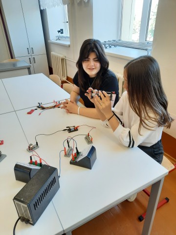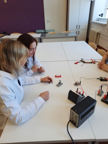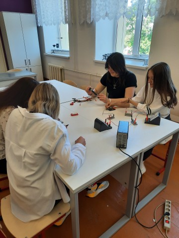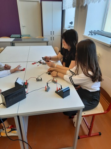 В апреле 2022 года прошло занятие по теме: "Расчет силы тока и напряжения в цепи при разных видах соединения проводников". Измеряя силу тока на различных участках цепи, учащиеся убедились в том, что сила тока при последовательном соединении на всех участках одинакова, а также на практике закрепили полученные на уроках знания.